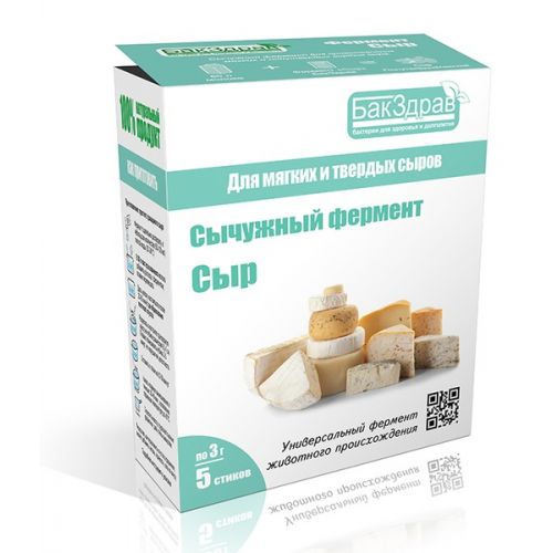 Сычужный фермент «Сыр БакЗдрав» - продукт животного происхождения, изготовлен из телячьих сычугов высшего сорта. Отсутствие в продукте ГМО, ГММ, консервантов подтверждено сертификатами аккредитованных лабораторий.
